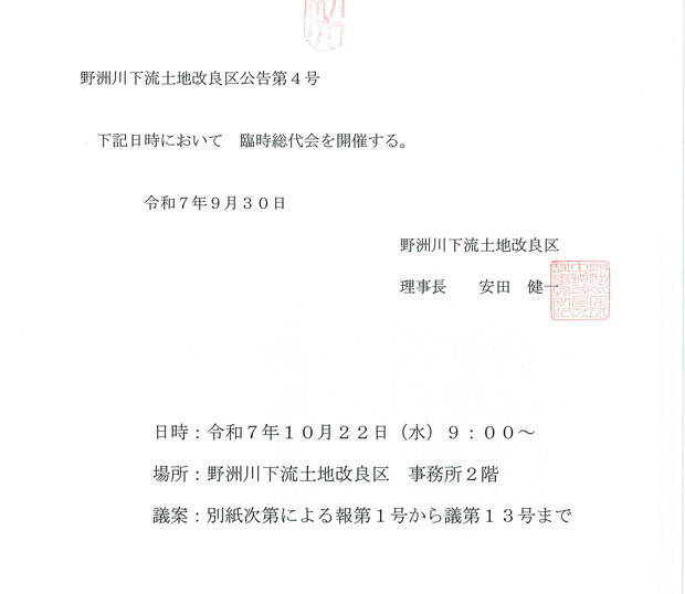 令和6年10月4日開催されました野洲川下流土地改良区臨時総代会におきまして、議長に玉本邦雄さん(野洲市入町)が選任され、次の事項が原案通り承認ならびに可決されました。(出席総代数66名(内、書面による出席32名):出席率84.6%)